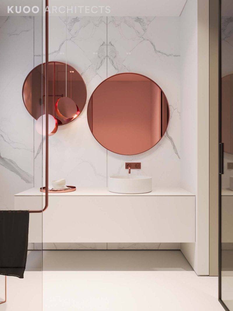 Bathroom Crush nr° 18 for this bathroom designed and visualized by polish architects team KUOO. The whole house is filled with brilliant accents of shining gold, copper and rose gold, and this bathroom captured my attention thanks to the combination of “cold” marble with “warm” rose gold accessories.