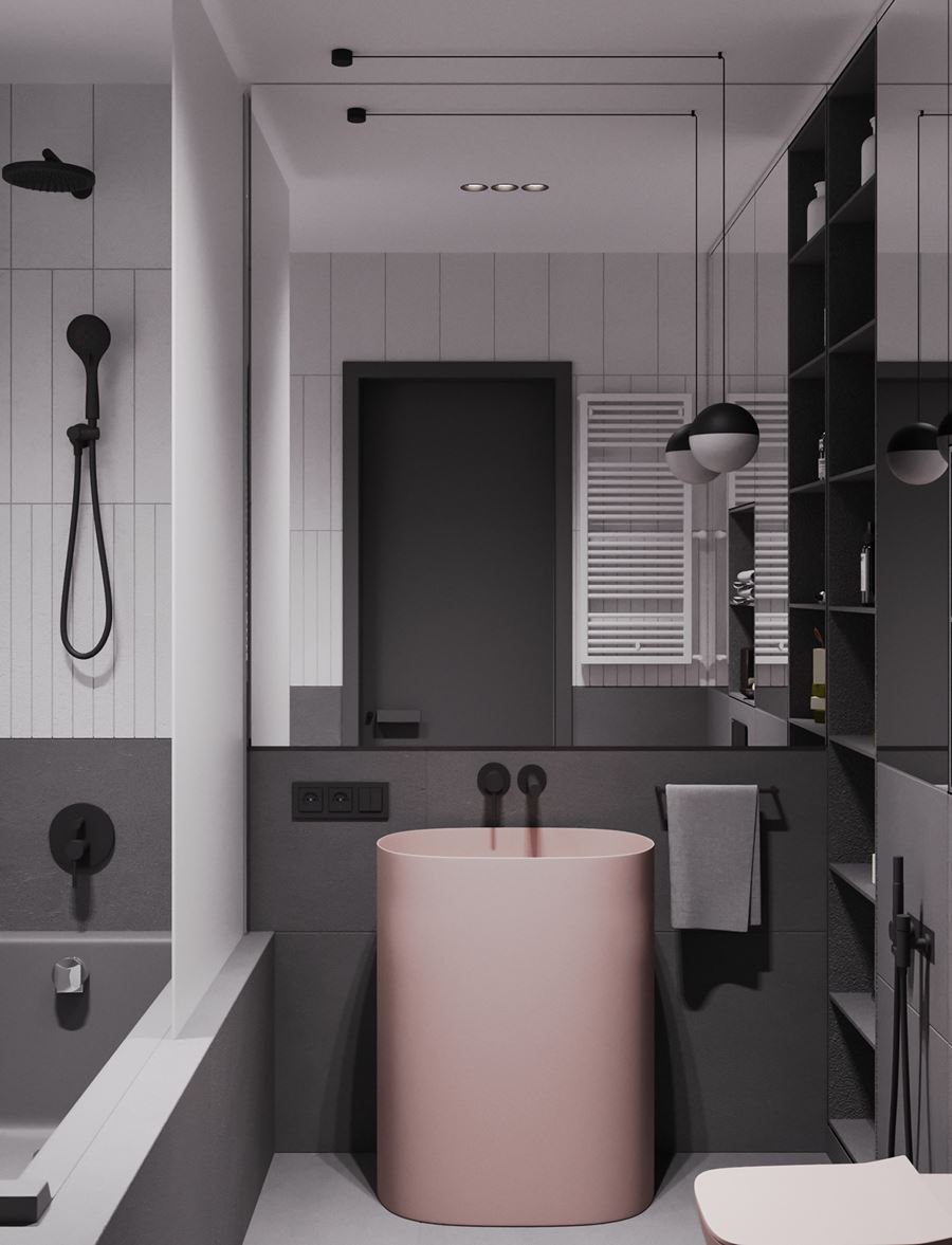 Ucraina | Il bagno di una casa tutta arredata in grigio e rosa. (Credits)
