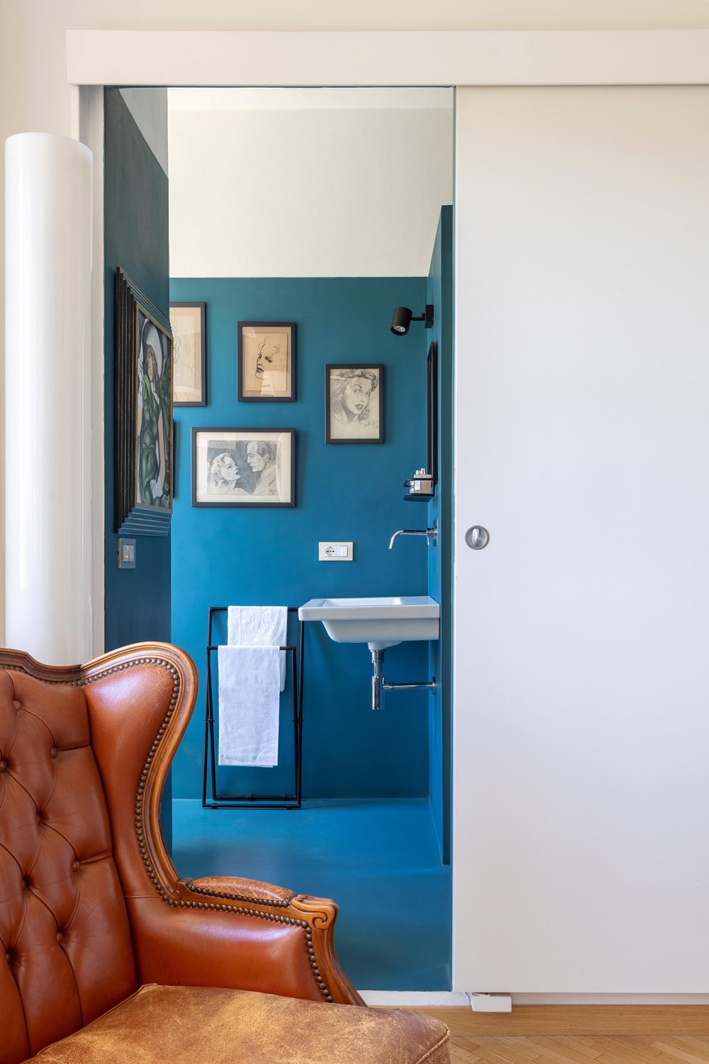 IL BAGNO PROTAGONISTA DI QUESTO POST È FRUTTO DELLA RISTRUTTURAZIONE DI UN APPARTAMENTO ANNI ’60. DIVISO DAL SECONDO BAGNO GRAZIE A UNA DOCCIA PASSANTE, È STATO COMPLETAMENTE RIVESTITO IN RESINA BLU, ACQUISENDO COLORE E CARATTERE. LO SCOPRIAMO ATTRAVERSO LE PAROLE DELLA SUA PROGETTISTA!