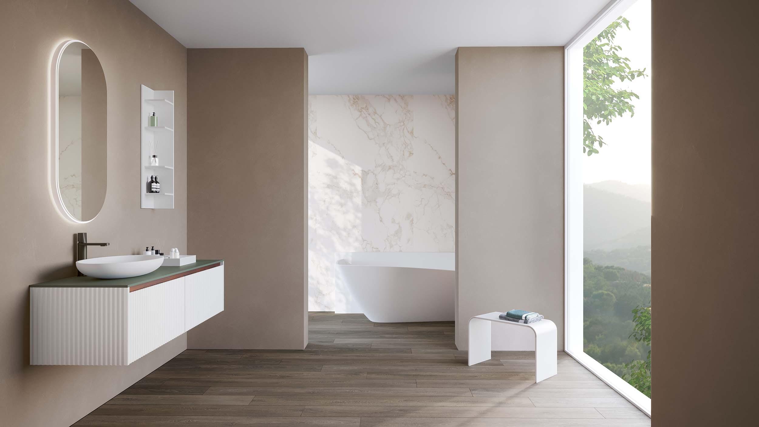 Dalla combinazione di questi materiali nelle variegate colorazioni nascono le moodboard acquapazza, che a loro volta danno vita a differenti ambientazioni. Una volta individuato il mood della stanza da bagno, inizia a prendere forma il mobile da bagno: si valutano la componibilità necessaria, l’attrezzatura interna (sponde, divisori), i fianchi e i frontali, il top e il lavabo, il tipo di maniglia (le aperture disponibili sono push&pull e a gola, nessuna maniglia per una totale linearità e pulizia estetica) e gli accessori come pensili e specchiere (Corian Elements).