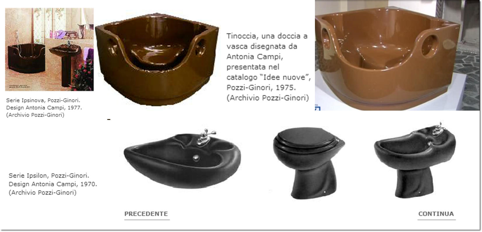 “Stanca però di essere imitata e mal interpretata, nel 1957 preferisce trasferirsi in un altro settore dell’azienda, quello dei sanitari: è l’inizio di una vera e propria rivoluzione fatta, innanzitutto, di forme nuove, attente all’ergonomia, e dell’inserimento del colore. Il bagno non è più un luogo da tenere nascosto, quasi sconveniente, ma un ambiente fresco, luminoso, da mostrare e da ammirare. Da menzionare per la forza innovativa i sanitari Torena (1958), che evocano la superficie a lamelle di un fungo con il lavello dal profilo asimmetrico; e la vasca Tinoccia del 1976-1977, che assomma diverse funzioni (Credits).”